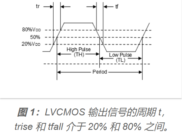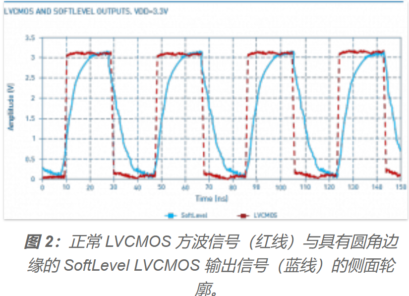 圖1顯示了上升和下降幅度在20%到80%之間的LVCMOS輸出信號的周期t。圖2顯示了在電源電壓為+3.3 VDC時,正常LVCMOS方波信號(紅線)與SoftLevel LVCMOS輸出信號(藍線)的側(cè)面輪廓。該圖表清楚地顯示了SoftLevel函數(shù)如何使方波的邊緣圓化(產(chǎn)生類似鯊魚鰭的形狀),從而顯著減少諧波泛音。圖3顯示了與輸出信號周期t相關(guān)的EMC - EMI衰減(奇諧波泛音)。Trise和tfall與時鐘信號的周期t成比例表示。