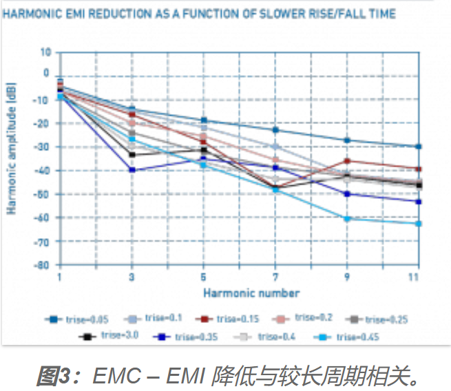 trise和tfall可以在t的0.05到0.45(5%到45%)范圍內(nèi)延長。如果trise和tfall與基信號相比延長5%,則信號形狀非常接近原始方波信號。當(dāng)延長至45%時,輸出信號的形狀越來越像魚翅,在第11次諧波處,EMC - EMI衰減大于- 60 dB。如此簡單的升降調(diào)整價值巨大。